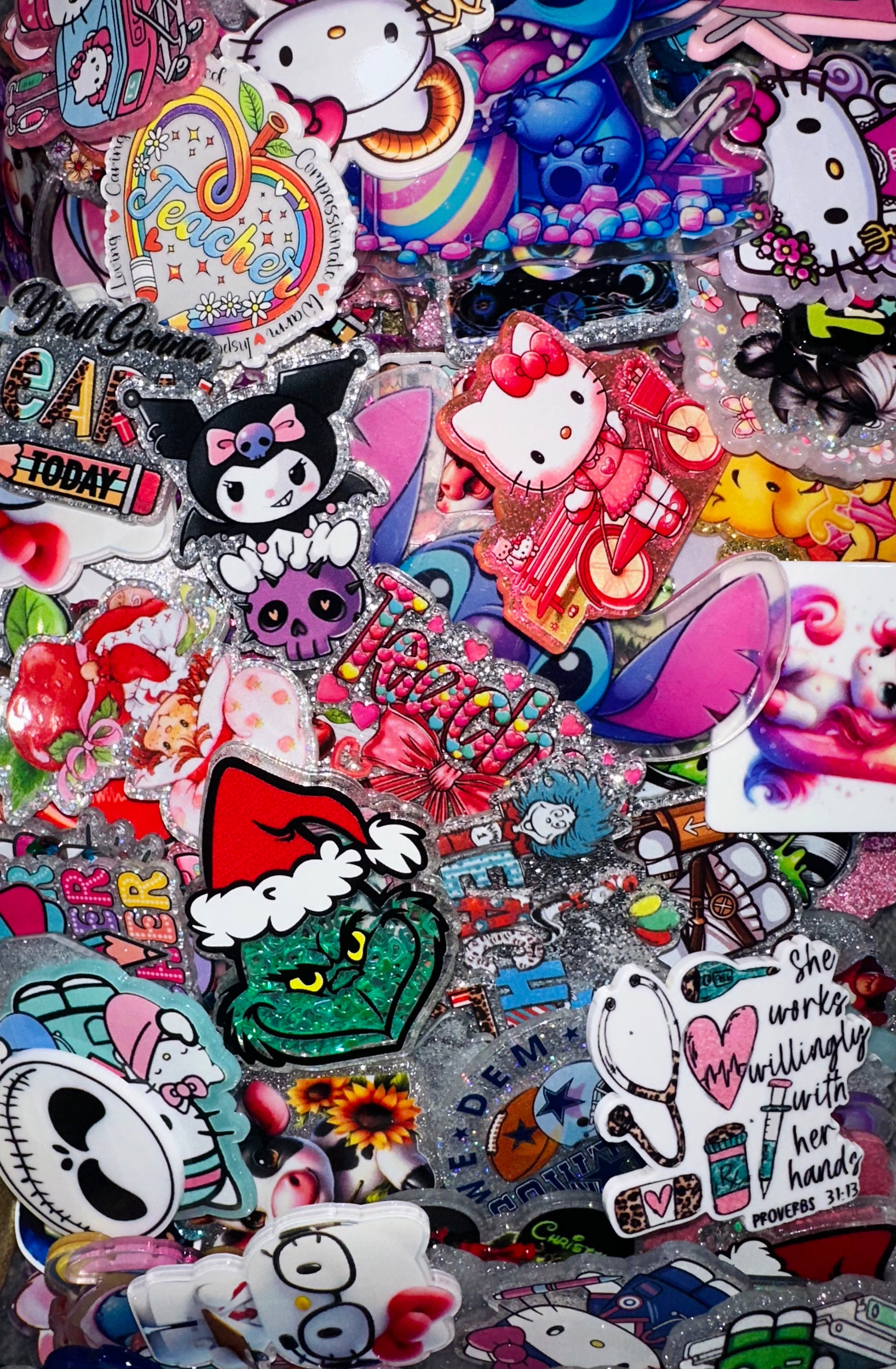 Our Acrylic Flat back mix is perfect for Badge Reels, Cup lids & more! This item is a one size only product. You will receive 25 flat backs at random. Mix may include Disney, Sanrio, Holiday, etc!